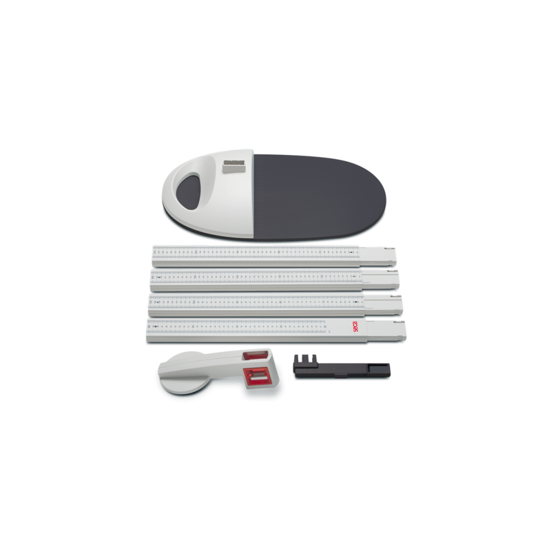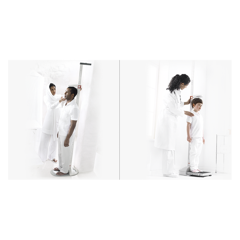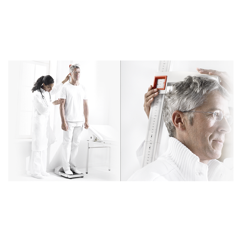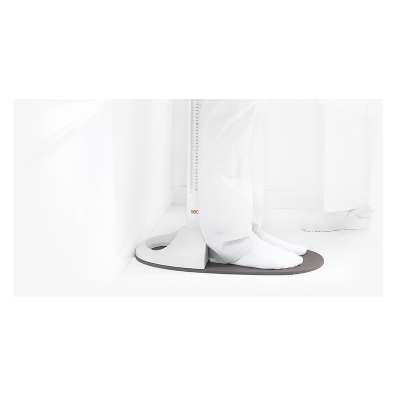 Combinée avec un pèse-personne plat, la toise se transforme en une station de mesure mobile.