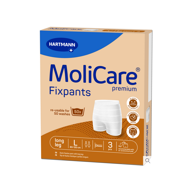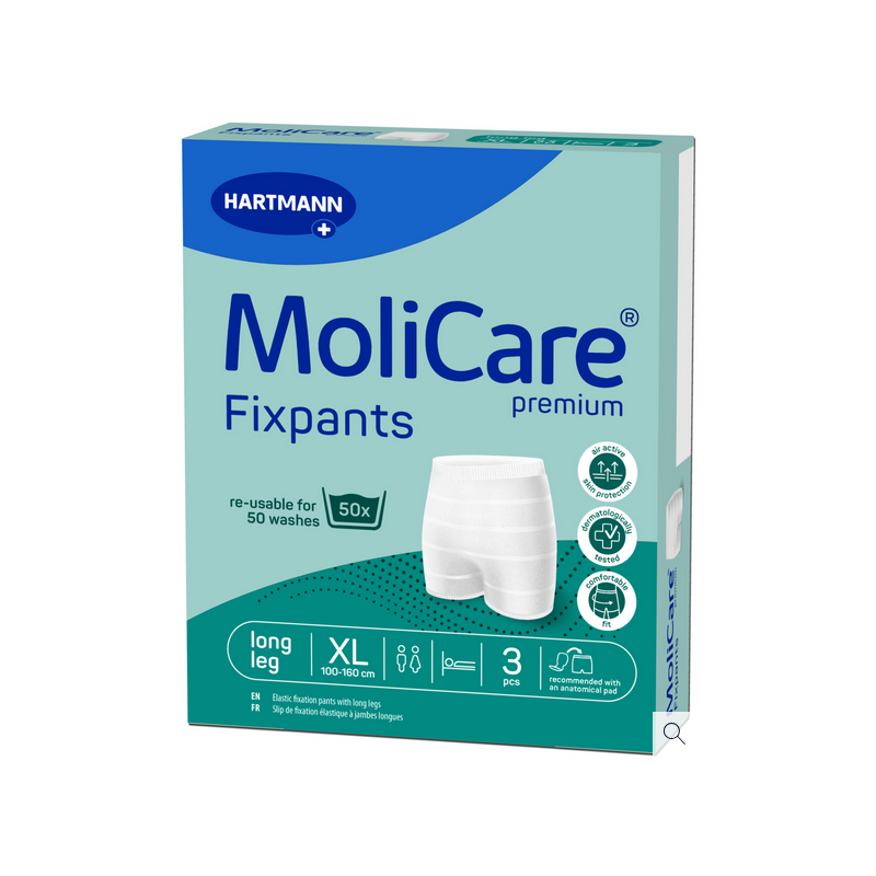 Les Molicare Premium Fixpants peuvent être lavés et réutilisés 50 fois, ce qui en fait une solution économique et pratique pour les établissements de soins comme pour les particuliers.
